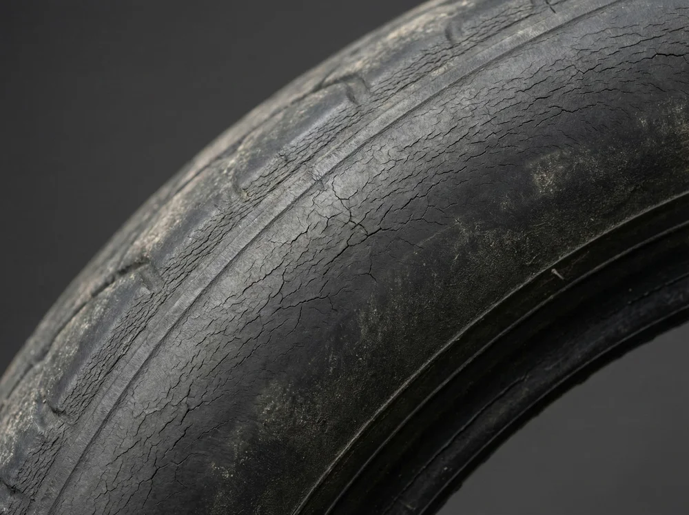 Banden verouderen, zelfs als ze weinig gebruikt worden. Droogtescheurtjes kunnen ontstaan en de elasticiteit van het rubber neemt af.